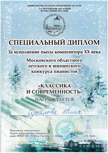 Юлия Суханова, ученица Жуковской Детской Школы Искусств №1, награждена специальным дипломом «За исполнение пьесы композитора ХХ века» Московского областного детского и юношеского конкурса пианистов «Классика и современность».